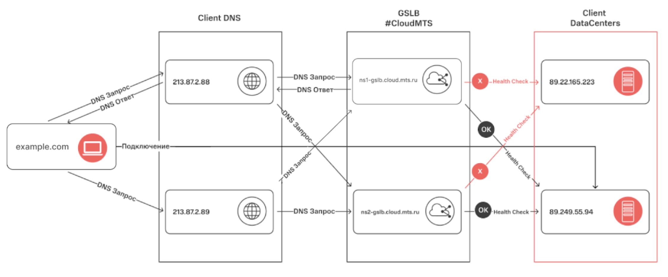 Когда DNS-сервер получает запрос от клиента (например, «какой IP-адрес у %example.com%?»), GSLB уже знает статус доступности ЦОДа. Клиенту не вернется IP-адрес выключенного узла. GSLB принимает решение о доступности ЦОДа в зависимости от интервалов и количества Liveness probes, которые указал пользователь.