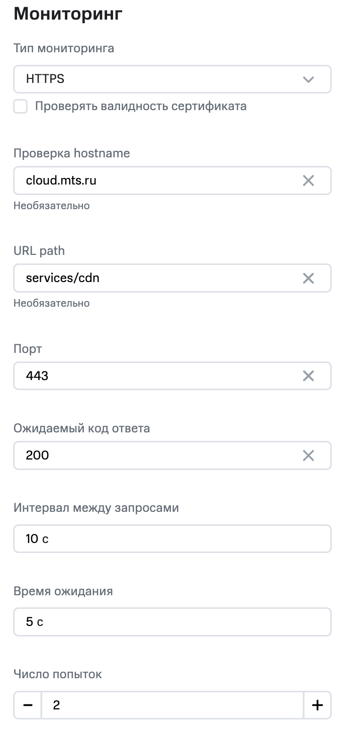 services/cdn/, то итоговый запрос будет выглядеть какcloud.mts.ru/services/cdn. - Порт — TCP порт, по которому происходит подключение пользователей к вашему приложению.
