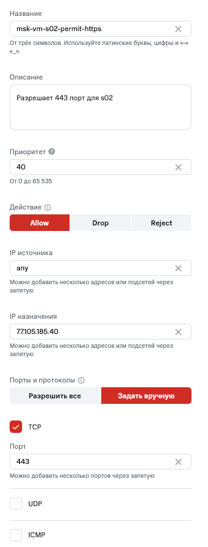 - Порты и протоколы — правило может запрещать/разрешать: