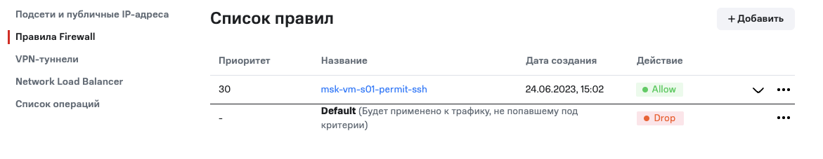 После завершения процесса создания новое правило отобразится в списке правил Firewall сети.