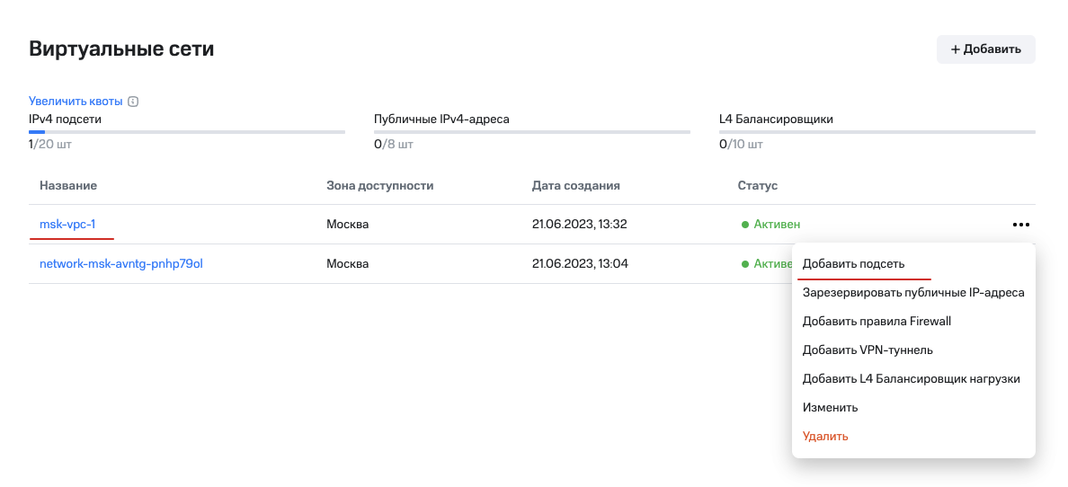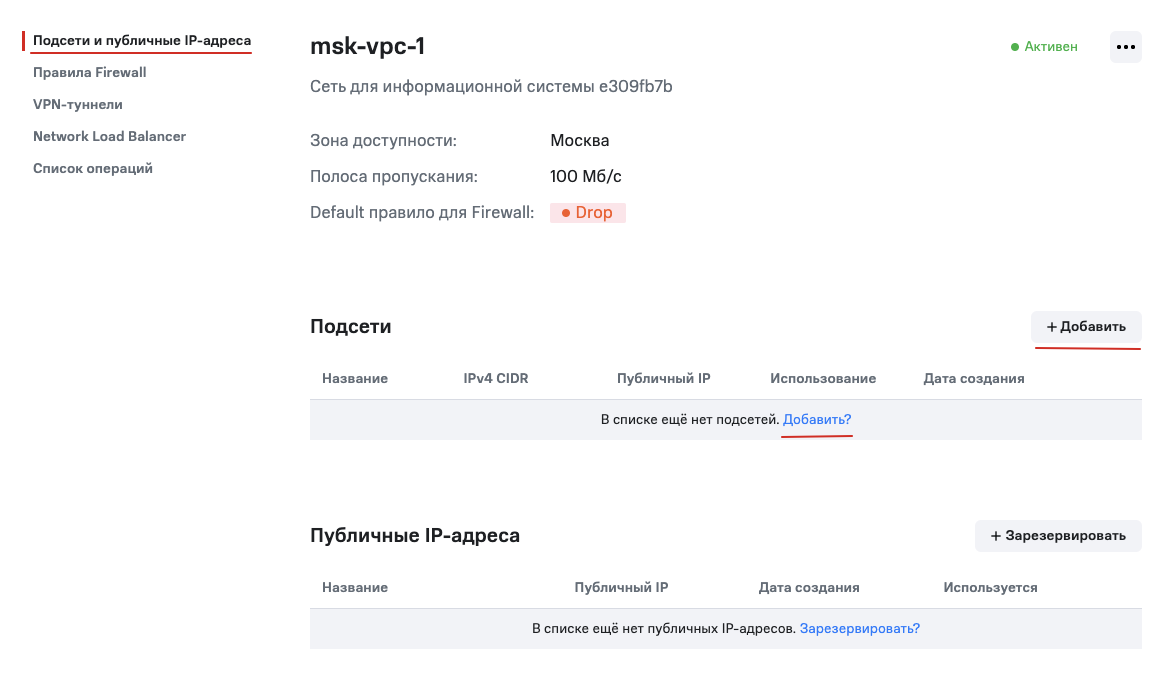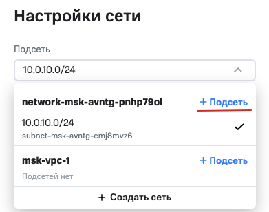 В разделе Настройка сети выберете сеть, в которую требуется добавить подсеть, и нажмите на кнопку +Подсеть. Если ни одна из существующих сетей не подходит, то можно создать новую сеть и подсеть. Подробнее...