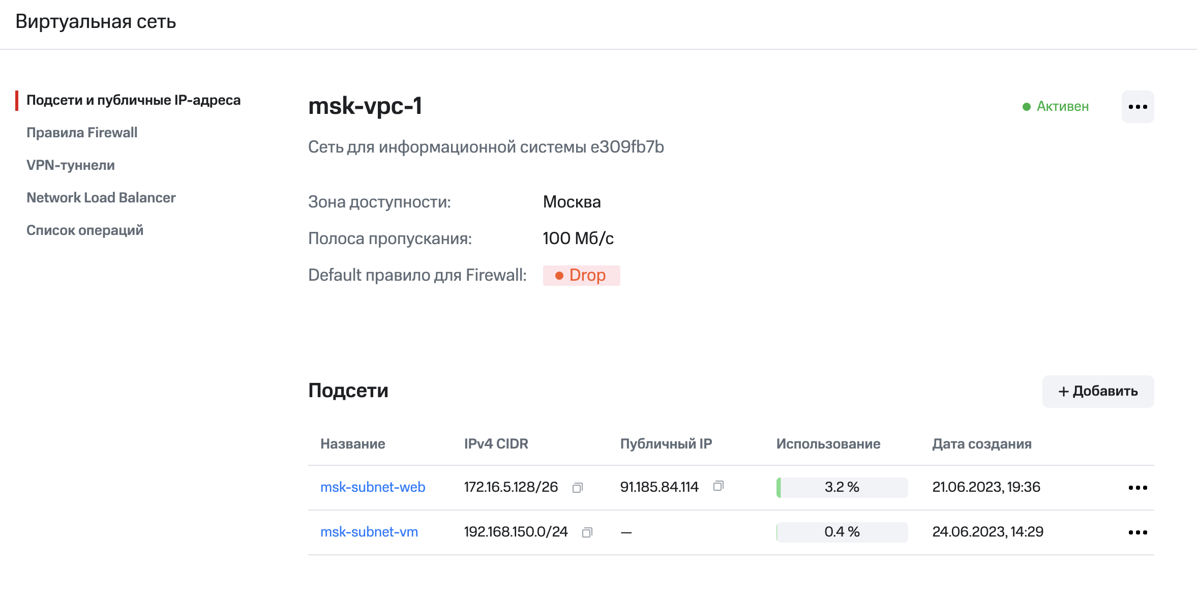 Предположим, что создана виртуальная сеть msk-vpc-1, в которую добавлены две подсети: msk-subnet-web и msk-subnet-vm.