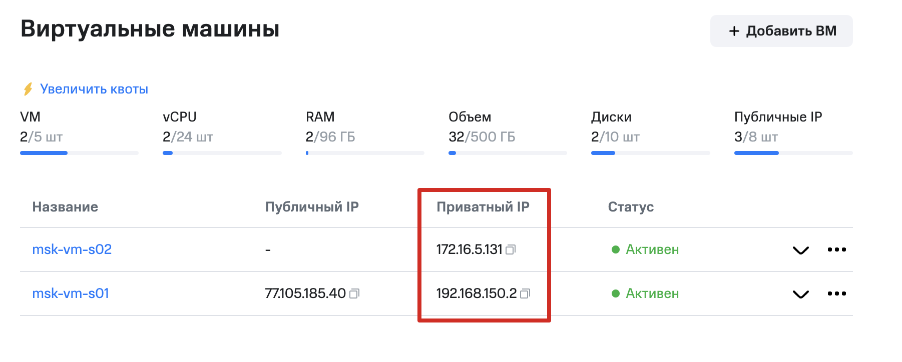 pingи убедимся, что виртуальная машина msk-vm-s02 отвечает по внутреннему (приватному) IP-адресу.$ ping 172.16.5.131PING 172.16.5.131 (172.16.5.131) 56(84) bytes of data. 64 bytes from 172.16.5.131: icmp\_seq=1 ttl=63 time=0.735 ms 64 bytes from 172.16.5.131: icmp\_seq=2 ttl=63 time=0.455 ms 64 bytes from 172.16.5.131: icmp\_seq=3 ttl=63 time=0.502 ms 64 bytes from 172.16.5.131: icmp\_seq=4 ttl=63 time=0.479 ms