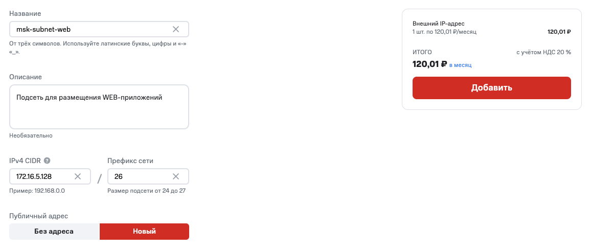 Нажмите на кнопку Добавить. Начнется процесс создания подсети.