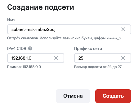 - Имя, Описание, IPv4 CIDR, Префикс сети — аналогично созданию подсети из интерфейса продукта.