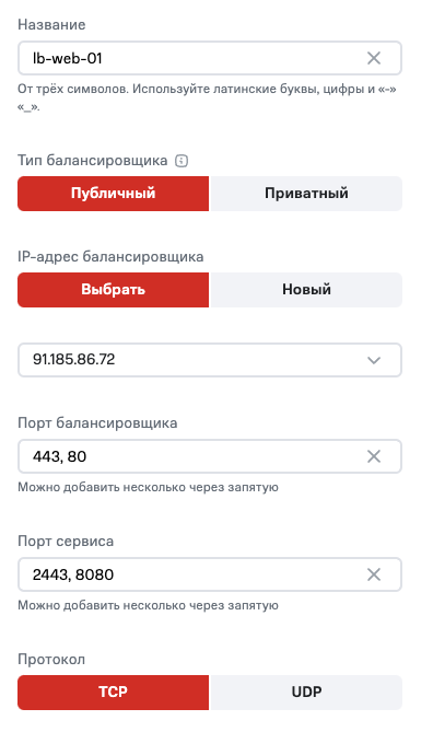 - Порт балансировщика — порт, который используется балансировщиком нагрузки для принятия входящих соединений, то есть является точкой входа для клиентов. Возможно указать несколько портов через запятую.
