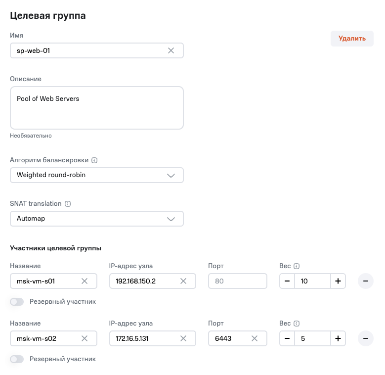 - Резервный участник — можно пометить участника как резервного, тогда на него трафик будет поступать только в том случае, если все остальные активные участники станут неработоспособными. Обычно применяется в Active-standby типах резервирования.