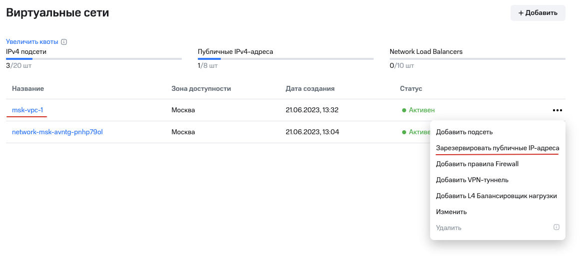 В разделе Публичные IP-адреса нажмите на кнопку +Зарезервировать.