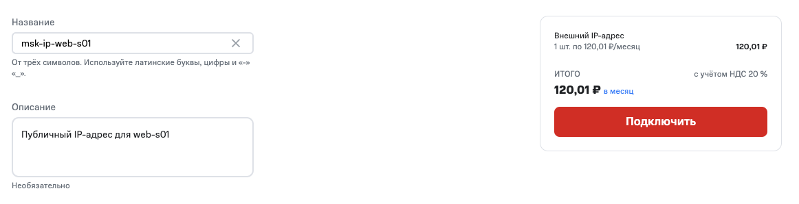 - Новый — аналогично секции Резервирование Публичного IP-адреса будет выделен Публичный IP-адрес из диапазонов MWS и сразу же назначен сервису.