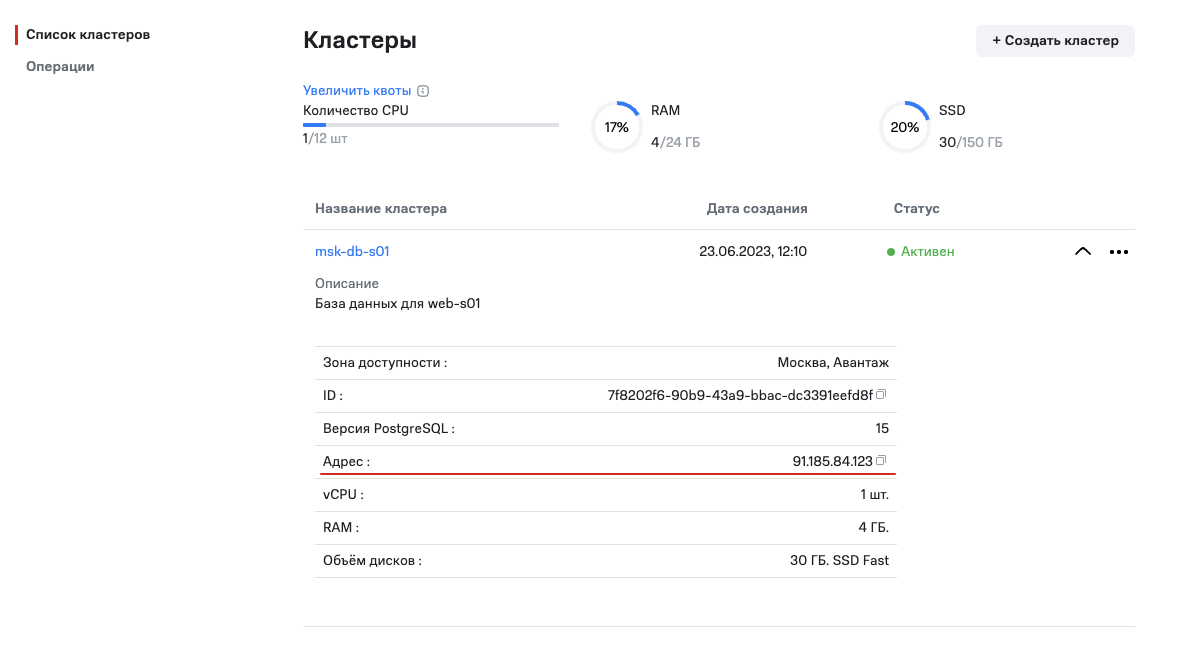 Перейдите в интерфейс любого сервиса из описанных выше, за исключением VPN-туннелей. Например, DBaaS for PostgreSQL.