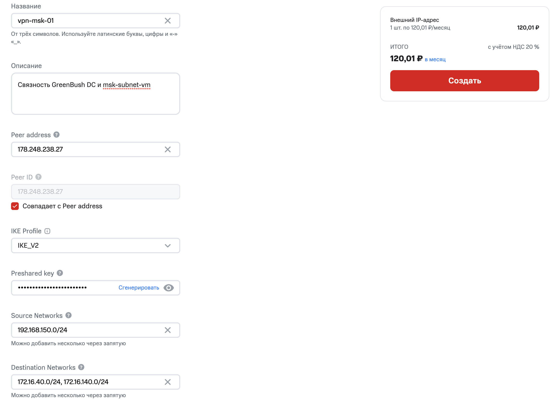 - Peer address — публичный IPv4-адрес стороны Б, с которым будет установлено VPN-подключение.