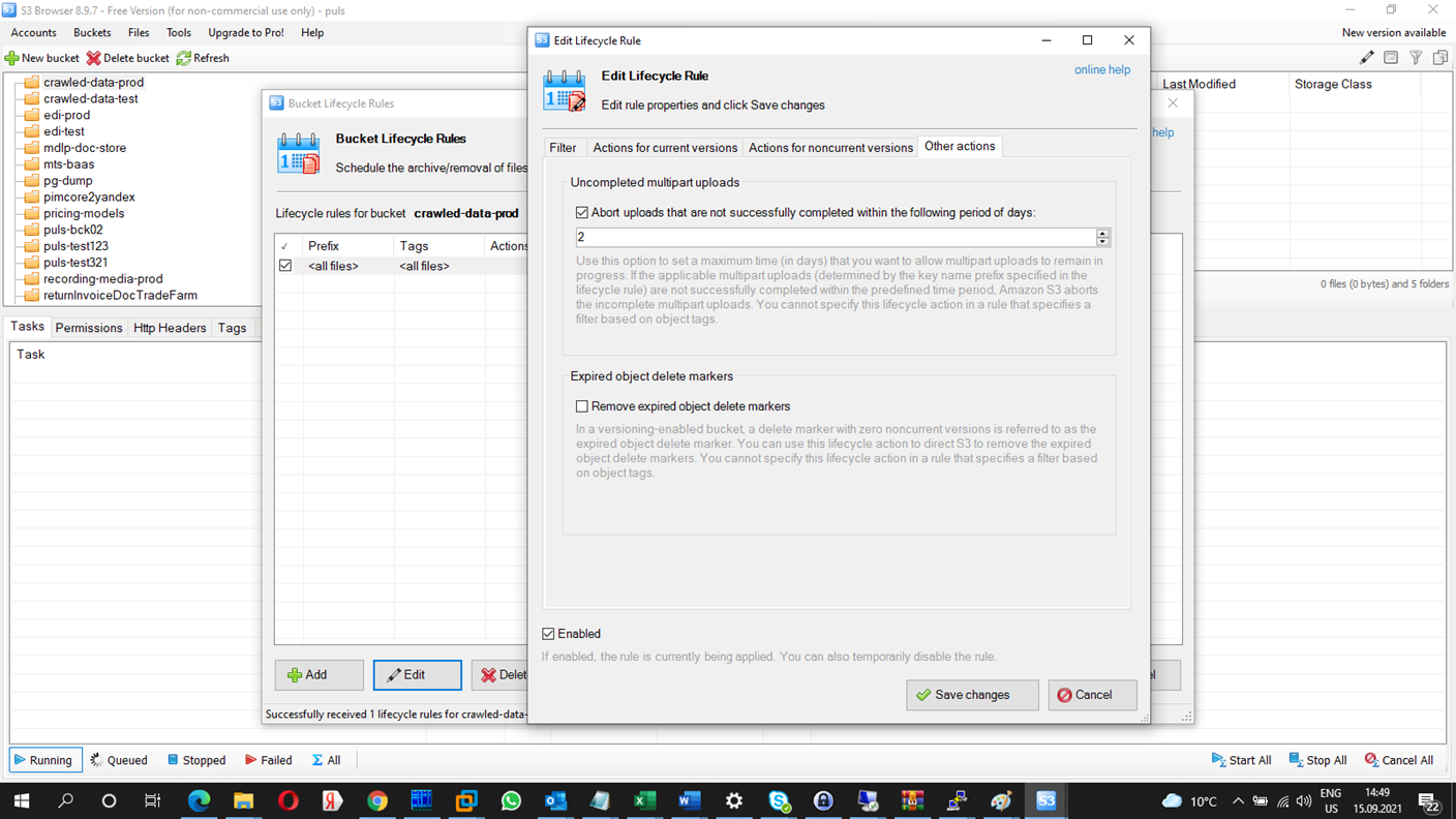 Для удаления незавершенных загрузок в "S3Browser" перейдите в Buckets > Bucket Lifecycle Rules и отредактируйте правило.