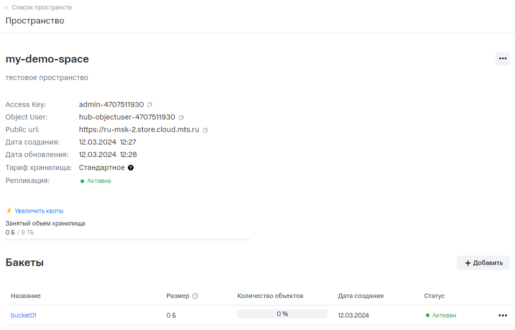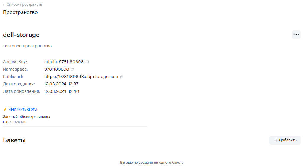 Чтобы узнать идентификаторы Namespace и Access Key созданного пространства, кликните на него в списке пространств. Идентификатор Namespace доступен только в решении на базе DELL.