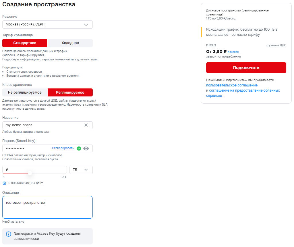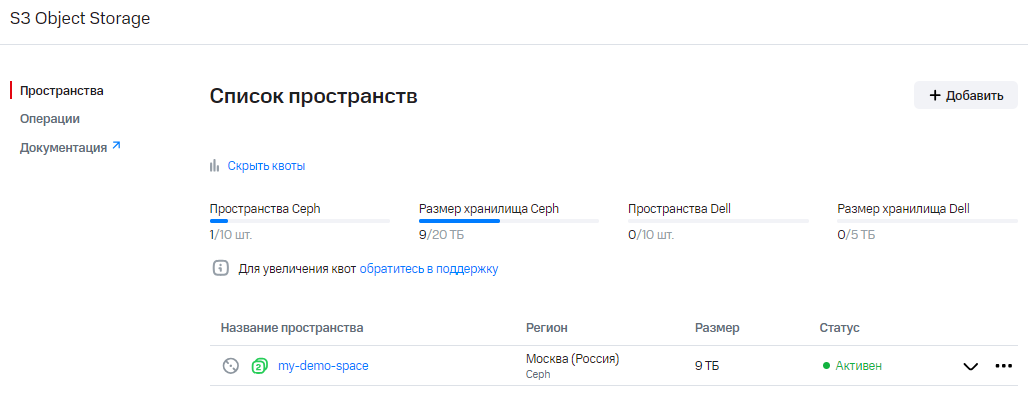 После того, как вы выбрали сервис Объектное хранилище S3 в левом меню консоли Cloud Hub и приступили к его конфигурированию, вам будет предложено создать пространство.