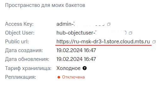 Secret Key(пароль, заданный вами при создании пространства в веб-интерфейсе сервиса). - Default region name [None] – оставьте пустым.