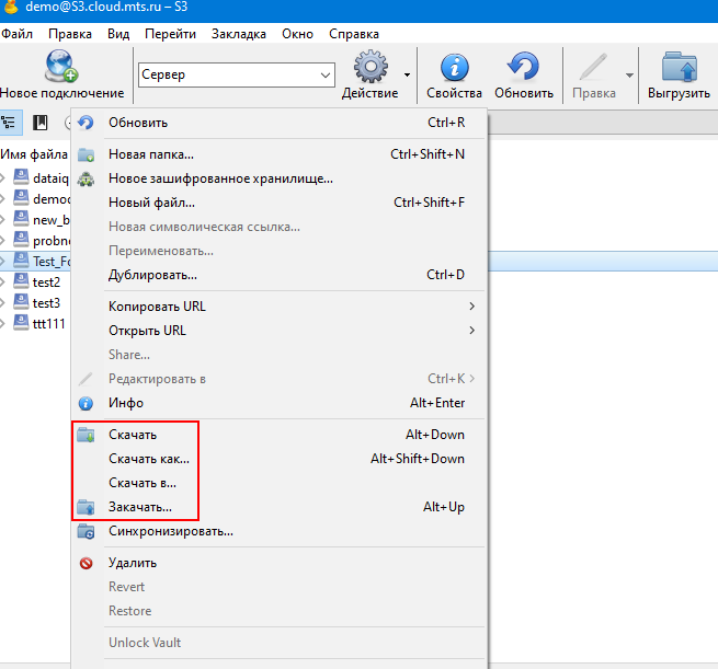 В раскрывшемся меню воспользуйтесь пунктами Скачать, Скачать как..., Скачать в..., Закачать...