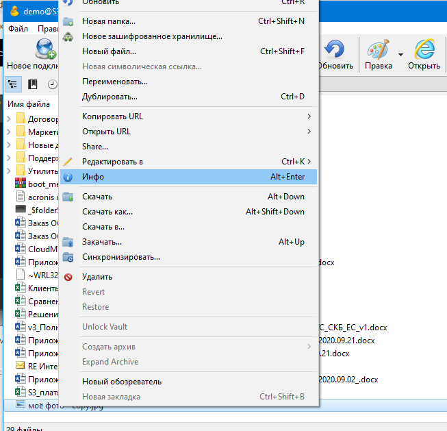 В раскрывшемся меню нажмите на кнопку Инфо.