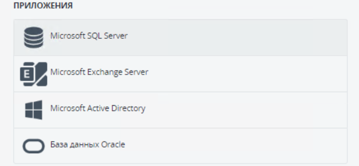 Приложение Агент Microsoft SQL CyberProtect Agent Microsoft SQL Server Microsoft Exchange CyberProtect Agent Microsoft Exchange Server Microsoft Active Directory CyberProtect Agent Microsoft Active Directory Oracle Database CyberProtect Agent Oracle В зависимости от расположения приложения − на физическом сервере или VM, будет определяться соответствующая стоимость использования. Например, если на одном сервере или виртуальной машине расположено несколько баз данных SQL, то тарифицироваться будет только CyberProtect Agent Windows Server. CyberProtect Agent Microsoft SQL Server тарифицироваться не будут.