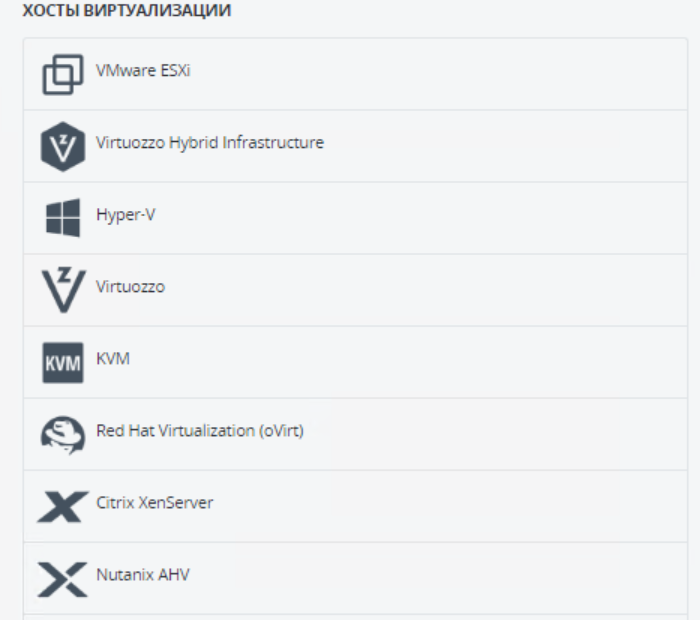 Платформа Агент VMware CyberProtect Appliance VMware ESXi Hyper-V CyberProtect Agent for Hyper-V oVirt CyberProtect Appliance oVirt Scale Computing HC3 CyberProtect Appliance HC3 Virtuozzo CyberProtect Agent for Virtuozzo В гостевой операционной системе: