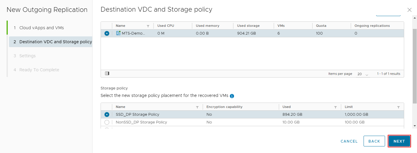 В окне Destination VDC and Storage policy: