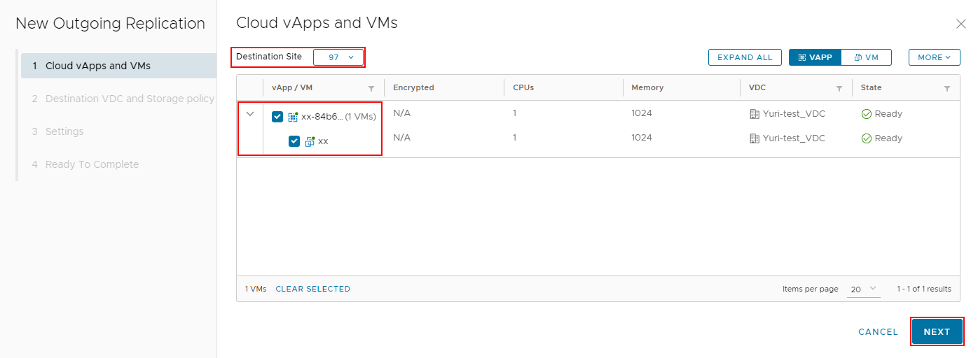 - Выберите контейнеры vApp или виртуальные машины, для которых необходима репликация.