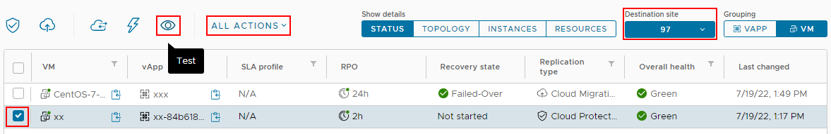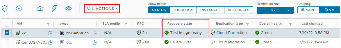 При тестовом переключении VM на площадке-источнике продолжают работать, а репликация продолжается.