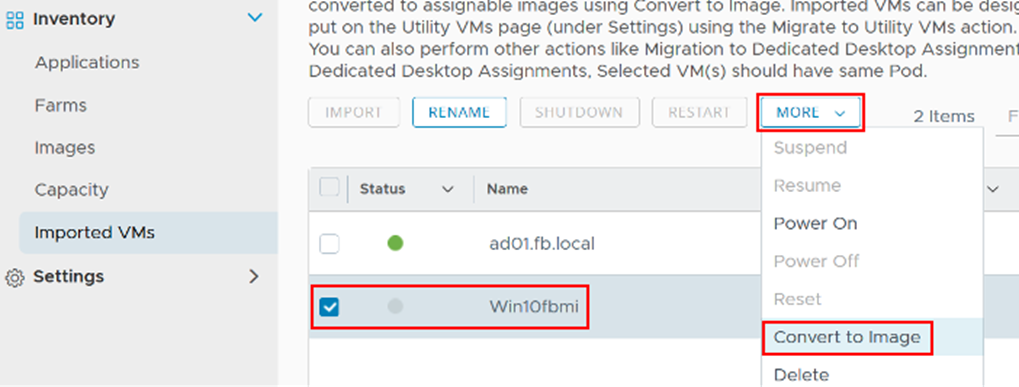 Чтобы повторить конвертацию в Мастер Образ, верните Мастер Образ в Imported VMs:
