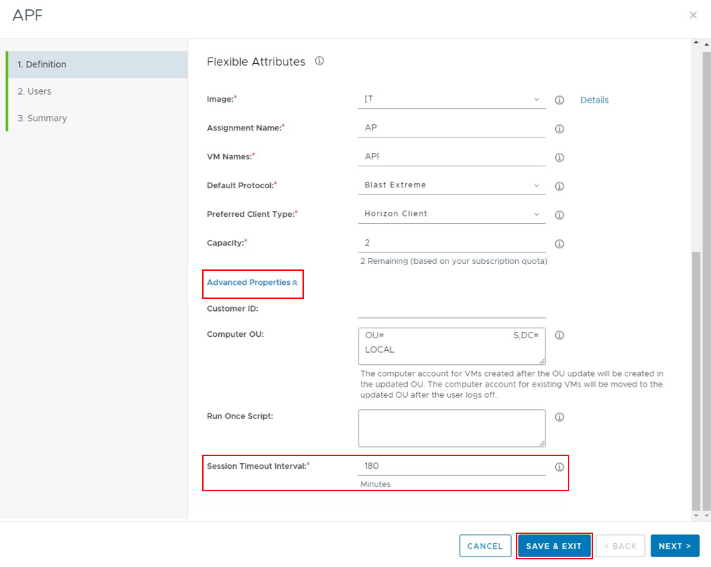 Для изменения Session Timeout Interval раздела Advanced Properties измените временное значение на необходимое.
