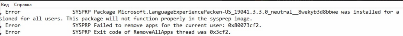 [0x0f00ae] SYSPRP WinMain:Hit failure while processing sysprep cleanup external providers; hr = 0x8007001fПодробности по ошибкам возможно увидеть в логах SYSPREP. Расположение логов: C:\Windows\System32\Sysprep\Panther.