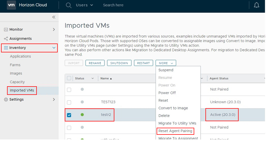 - В панели администратора Horizon DaaS откройте вкладку Imported VMs блока Inventory.
