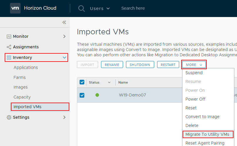 В выпадающем меню выберите Migrate To Utility VMs.