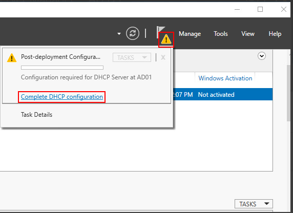 В панели управления сервером нажмите на кнопку Complete DHCP configuration.