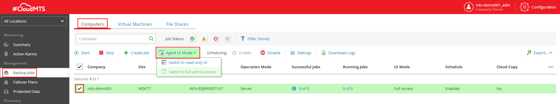 Чтобы получить возможность локального управления, переключите Agent UI Mode в режим "Full admin access" для нужного бэкап-агента через VSPC: