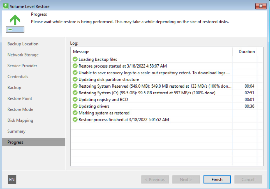 На вкладке Progress дождитесь завершения восстановления и нажмите на кнопку Finish.