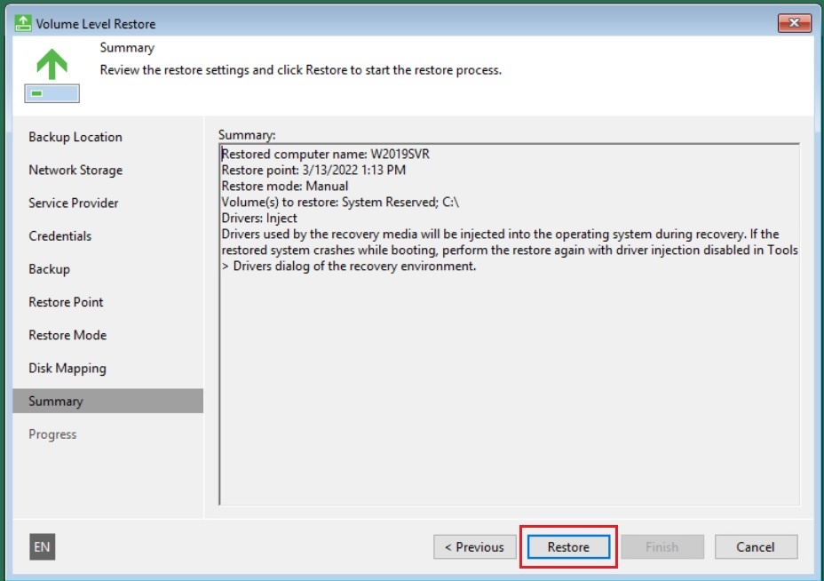 Мастер готов к началу процесса восстановления. На вкладке Summary нажмите на кнопку Restore, чтобы запустить процесс восстановления.