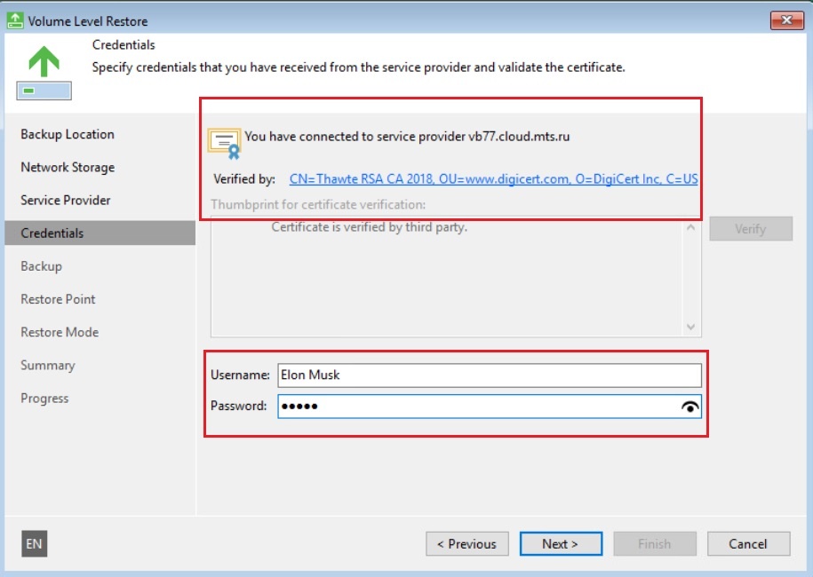 Укажите учетные данные вашей организации на вкладке Credentials.