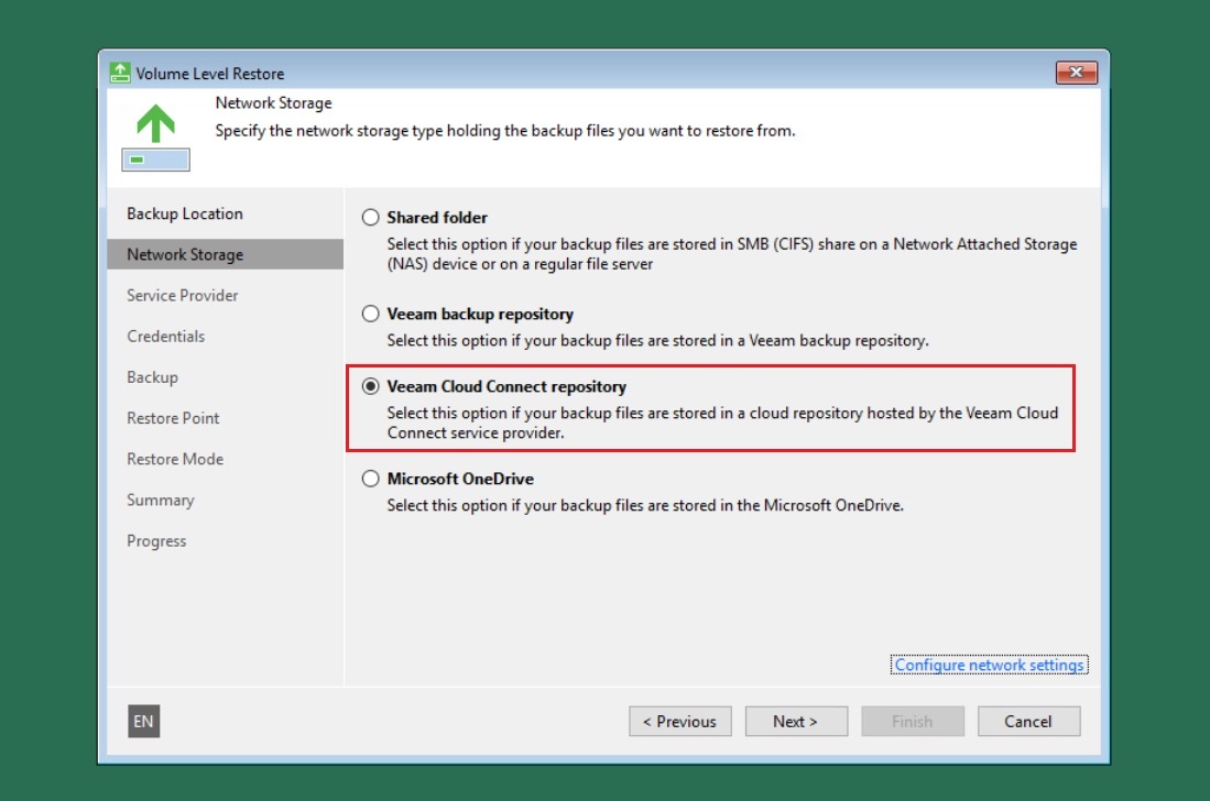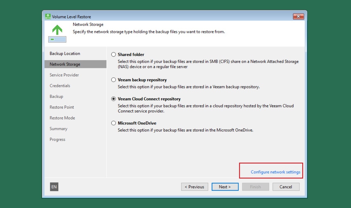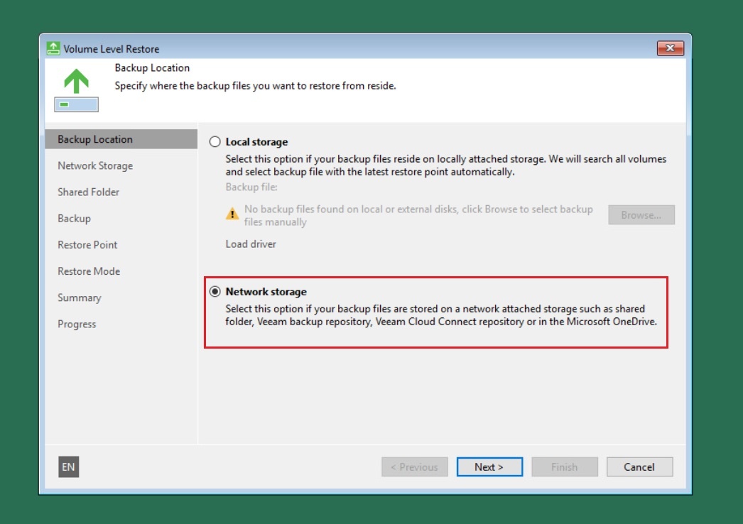 На вкладке Backup Location выберите сетевое хранилище в качестве локации.