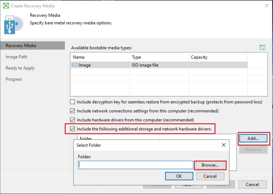 Если необходимо, задать дополнительные параметры. Добавьте в ISO-образ дополнительные драйвера, включив опцию Include the following additional storage and network hardware drivers.