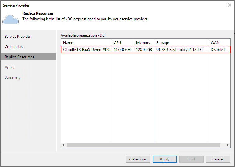 На вкладке Replica Resources проверьте наличие ресурсов для репликации в облако MWS.