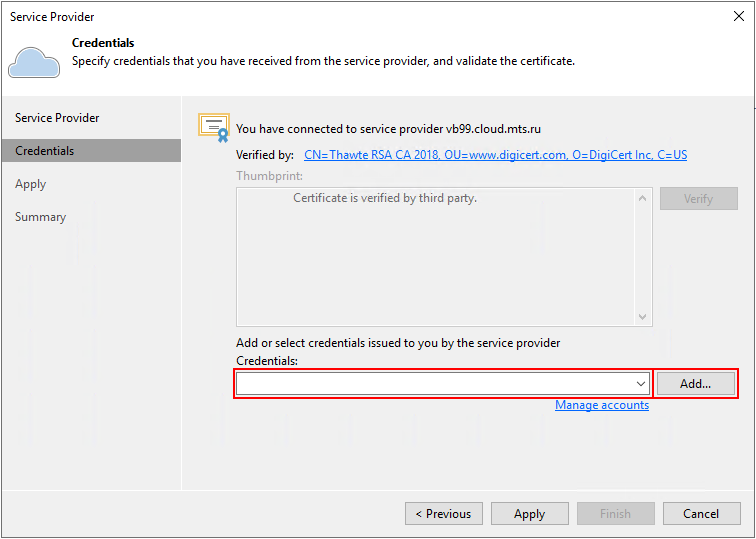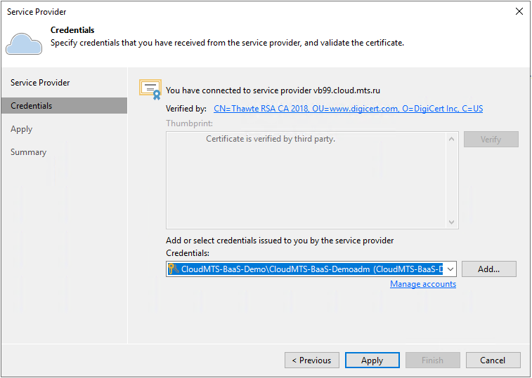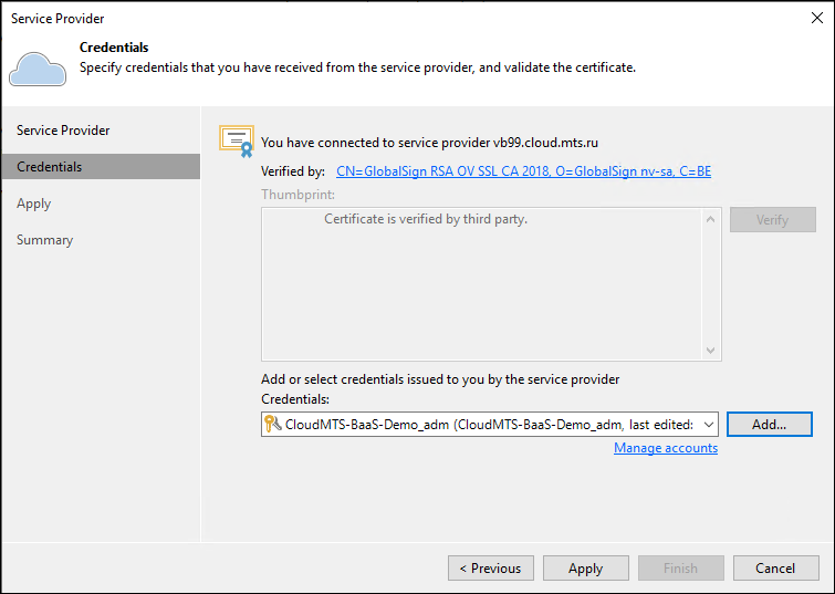 Перед миграцией необходимо выполнить подключение сервера Veeam Backup and Replication к ресурсам сервис-провайдера:
