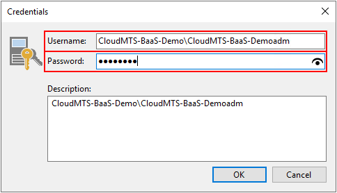 Если реквизиты доступа к сервису поступили в формате Username: MWS-BaaS-Demo\MWS-BaaS-Demo_adm Password: qwerty_09, то введите эти данные в полях Username и Password логин в формате <Учётная_запись_администратора> и пароль.