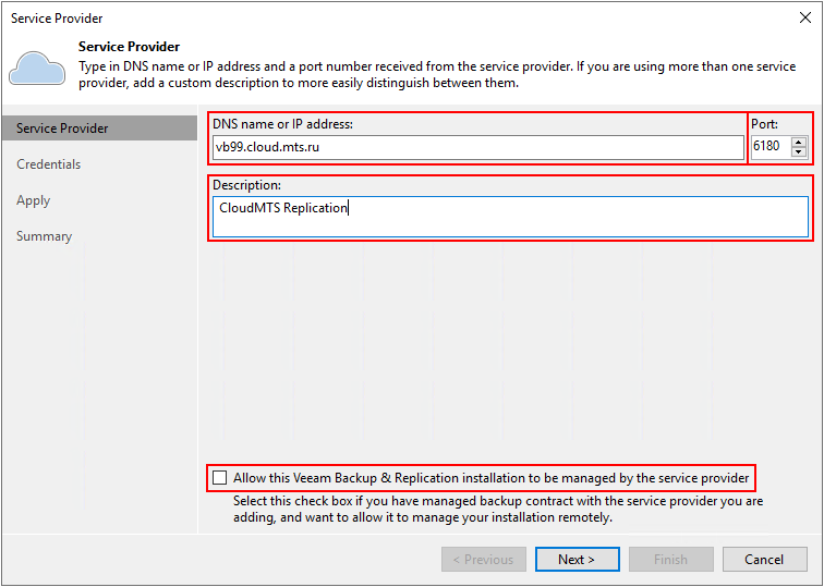 - Отключите опцию Allow this Veeam Backup & Replication installation to be managed by the service provider.