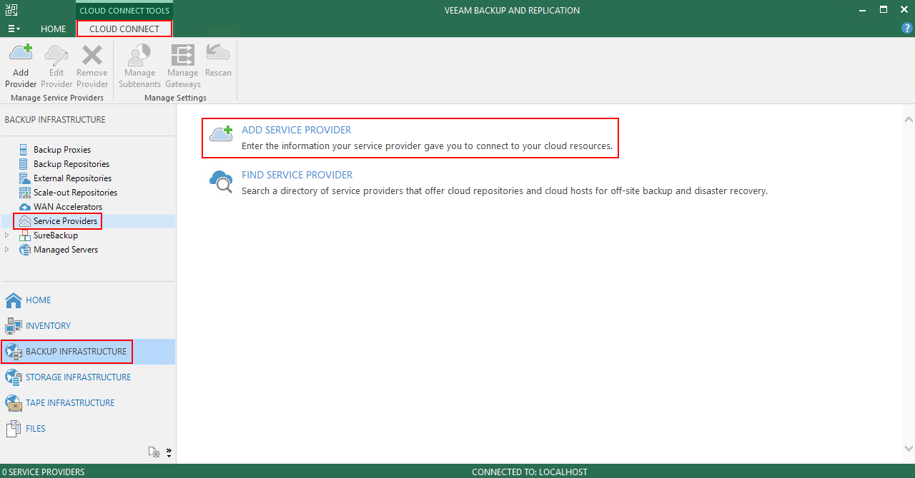 - Перейдите Backup Infrastructure > Service Providers > Cloud Connect.