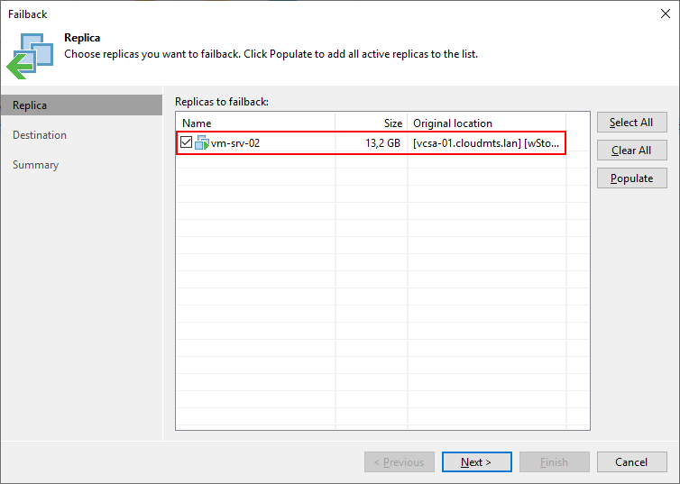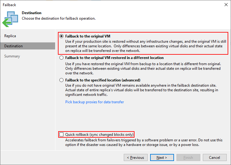 На вкладке Destination включите опцию Failback to the original VM. Если проблемы были связаны с ошибками приложения или случайным удалением (например, удаление гостевой ОС), включите опцию Quick rollback (sync changed blocks only), подробнее данная опция описана в данной статье.