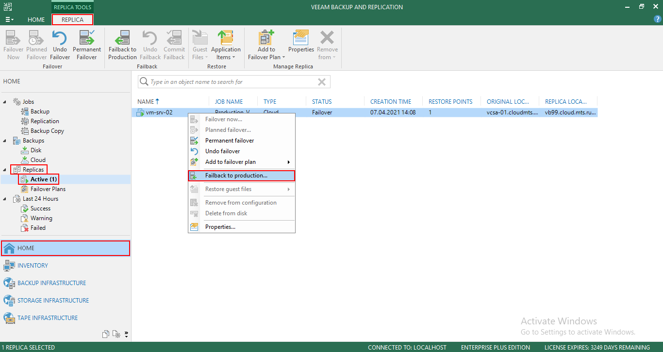 - Если VM удачно восстановлена на исходном хосте, возможно переключиться на нее с реплики виртуальной машины.