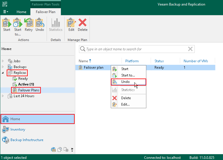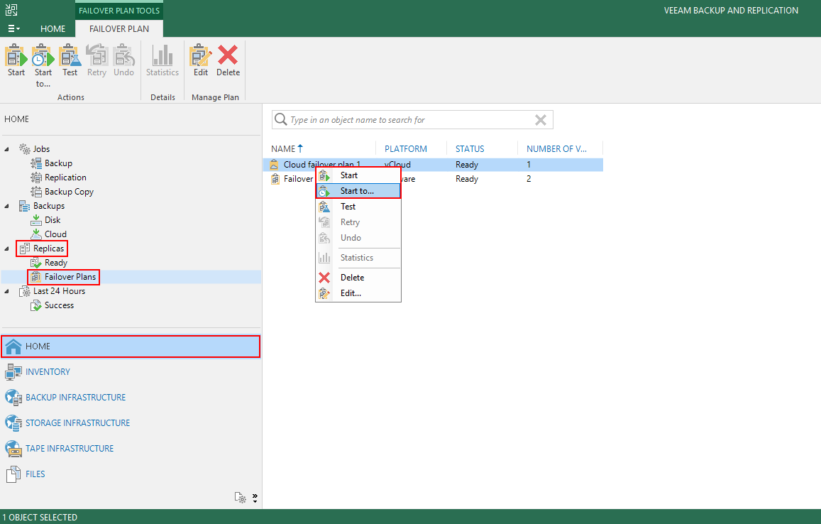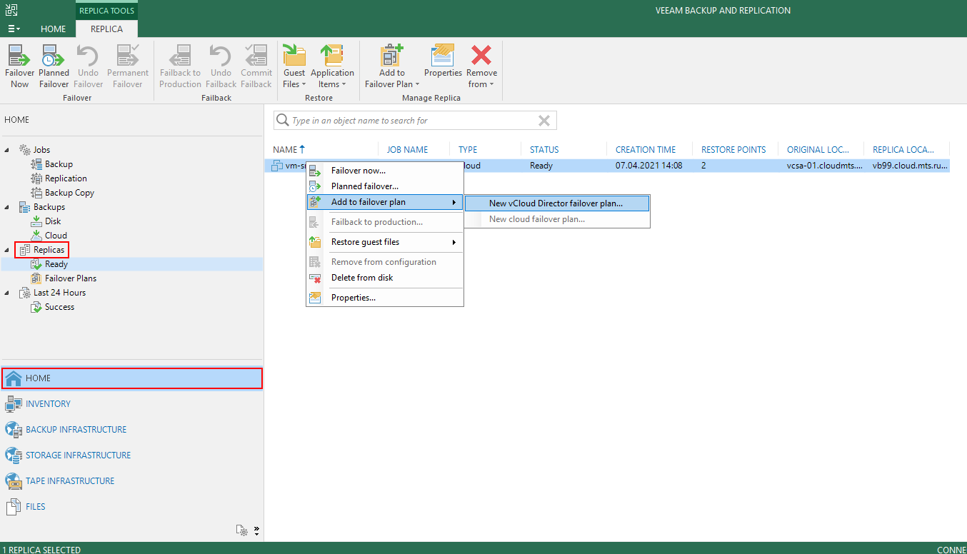 - В разделе HOME откройте пункт Replicas и подпункт Failover Plans.