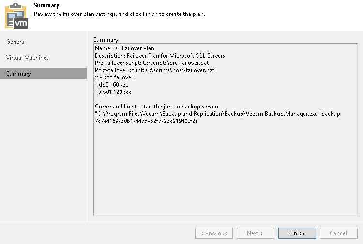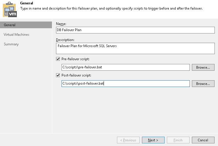 Veeam Backup & Replication поддерживает файлы сценариев в форматах *.bat, *.cmd, *.exe и *.ps1. Сценарии позволяют остановить некоторые приложения на рабочих VM до начала выполнения плана аварийного переключения или отправить электронное письмо администраторам резервного копирования после завершения выполнения плана аварийного переключения.