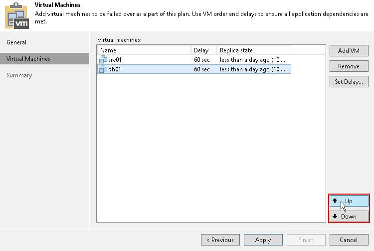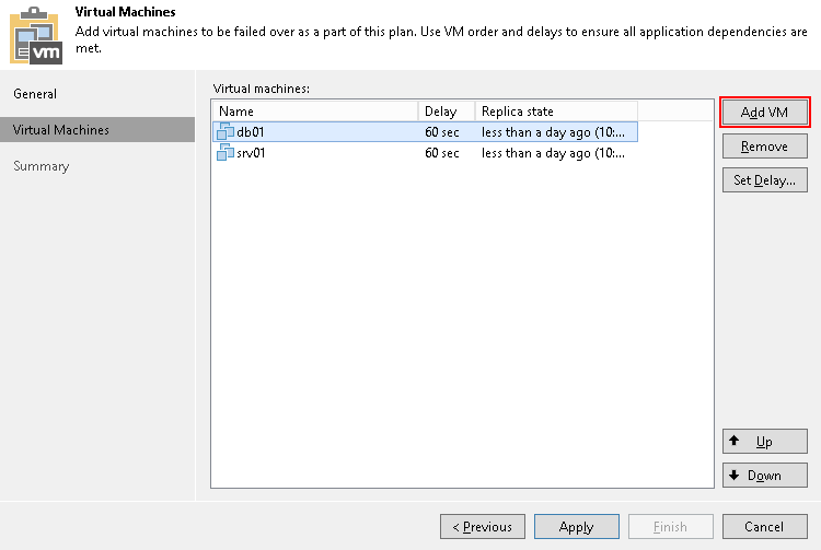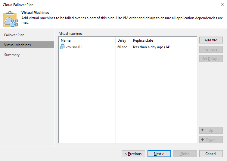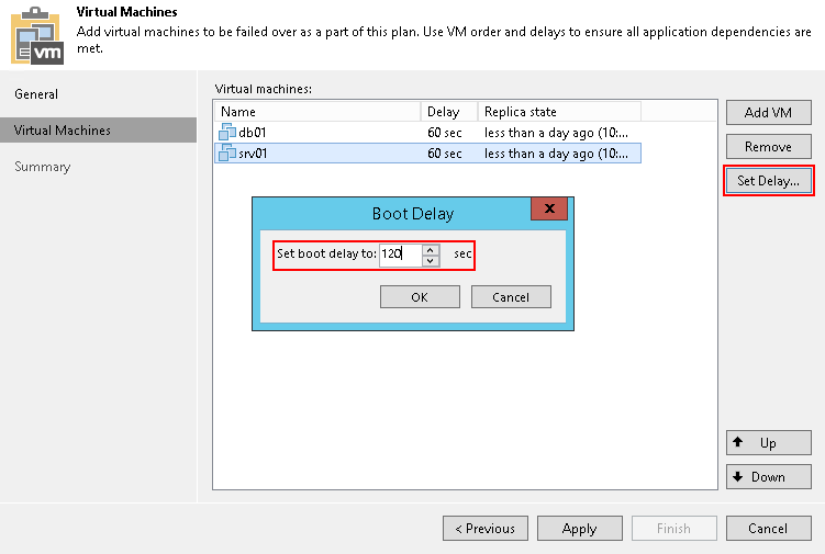 Время задержки определяет, как долго Veeam Backup & Replication должен ждать перед запуском операции аварийного переключения для следующей VM в списке. Возможно использовать временные задержки, чтобы убедиться, что некоторые VM уже работают в момент запуска зависимых виртуальных машин. Для последней в списке VM невозможно указать задержку. Если временные задержки не указаны, VM будут запускаться одновременно.