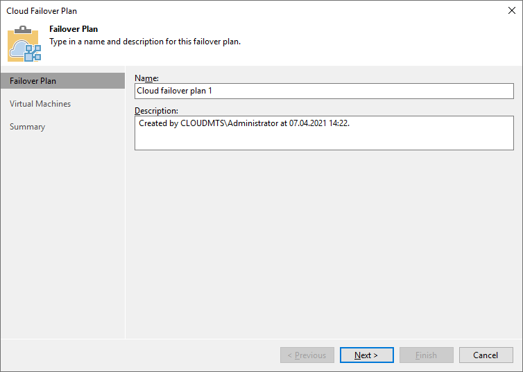 На вкладке Failover Plan ведите имя плана отработки отказа и описание, если это необходимо.
