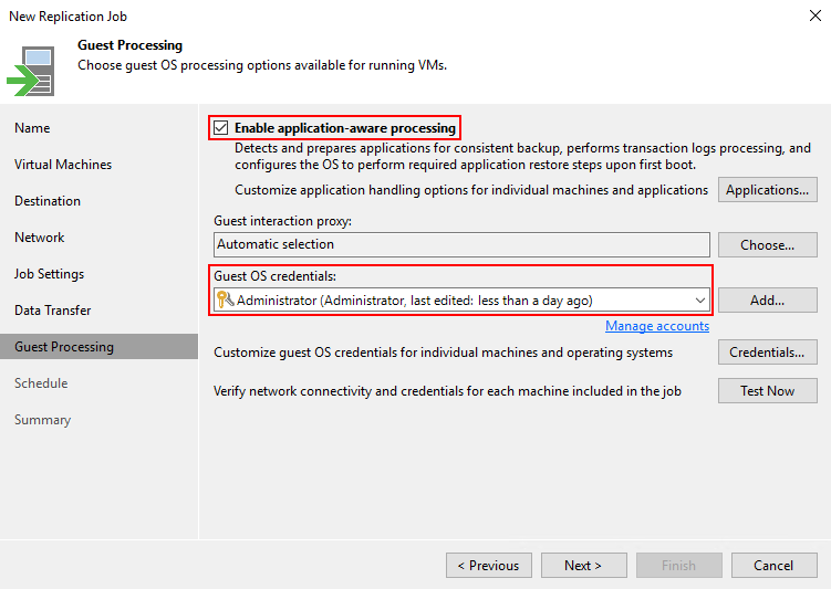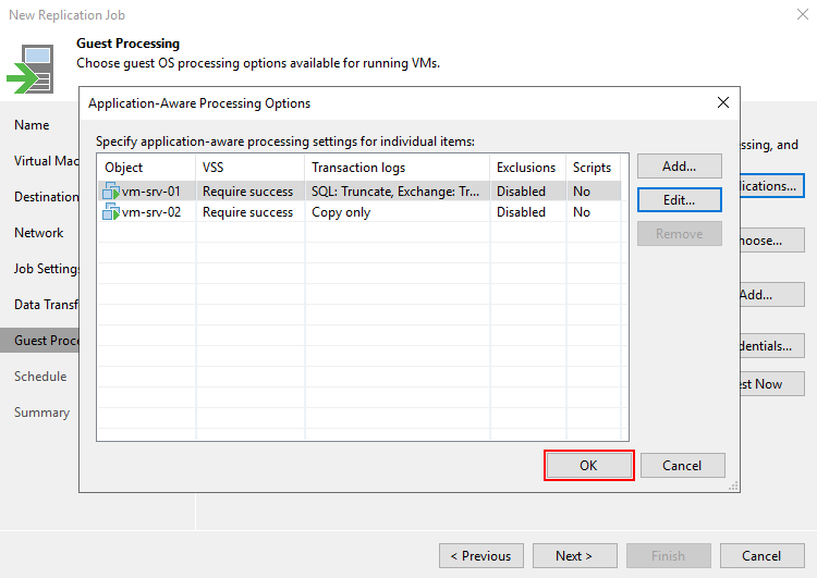 В окне Application-Aware Processing Options нажмите на кнопку OK.